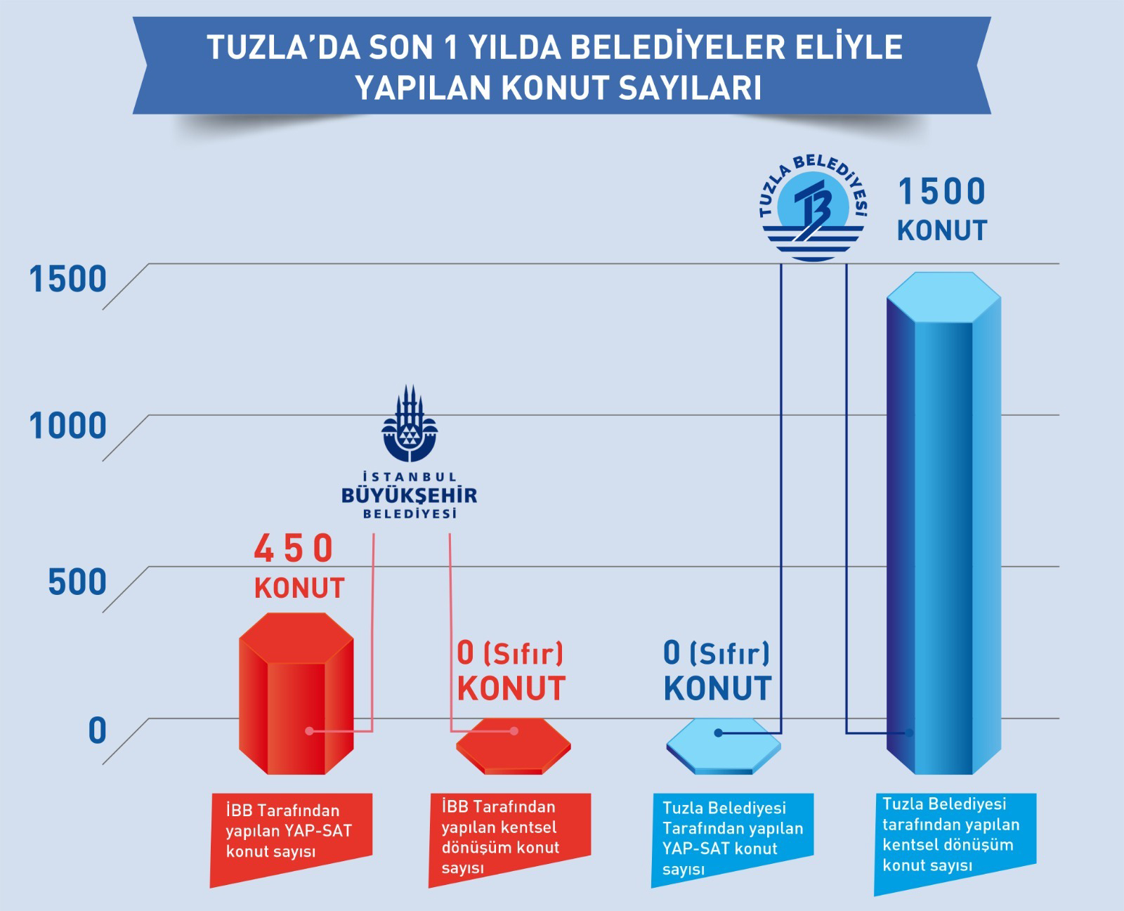 Tuzla Belediyesi’nin kentsel dönüşüm çalışmaları kapsamında 1500 konut ürettiğini ifade ederken, İBB’nin Tuzla’da kentsel dönüşüm kapsamında 1 konut bile yapmadığını, İBB eliyle yapılan konutların Yap-Sat işi olduğunu ifade etti.