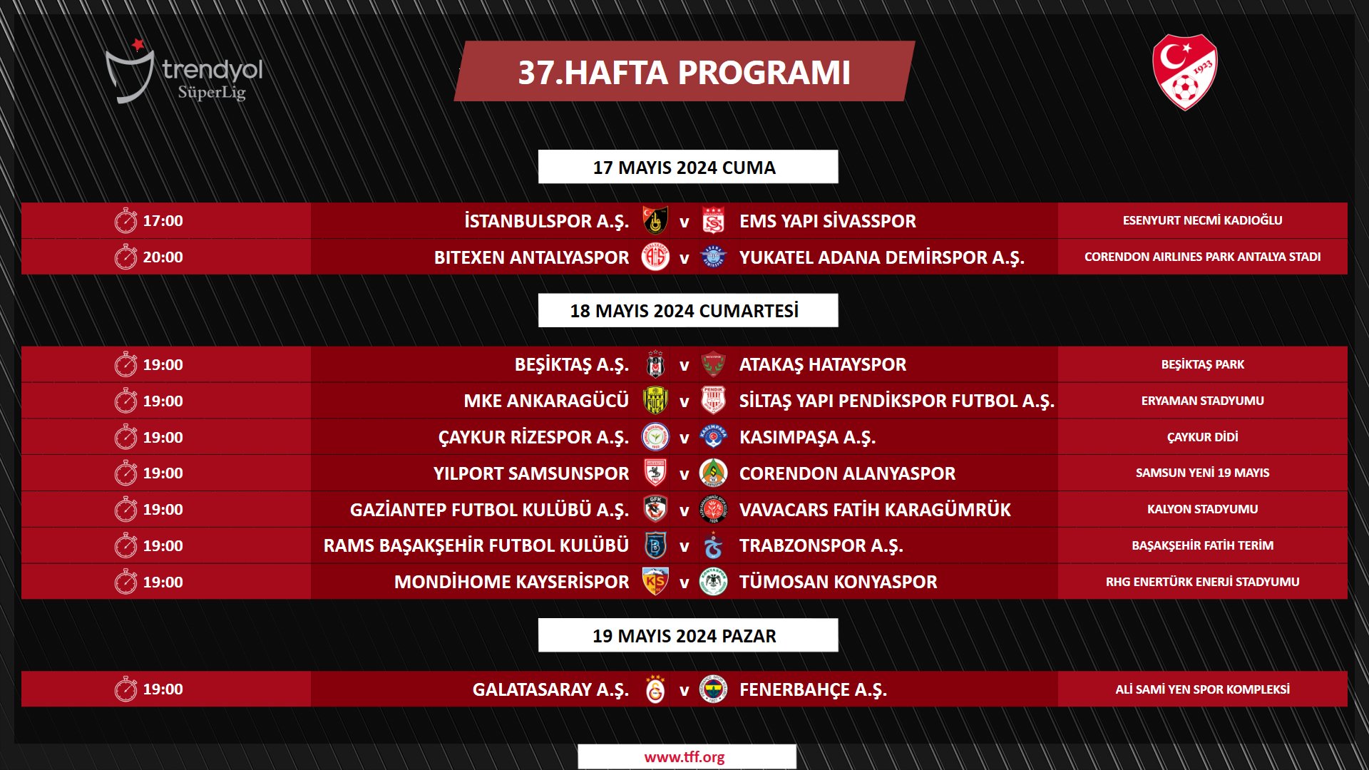 TFF, Süper Lig'in 37. haftasında Galatasaray ile Fenerbahçe arasında oynanacak derbi maçının 19 Mayıs Pazar günü saat 19.00'da başlayacağını açıkladı.