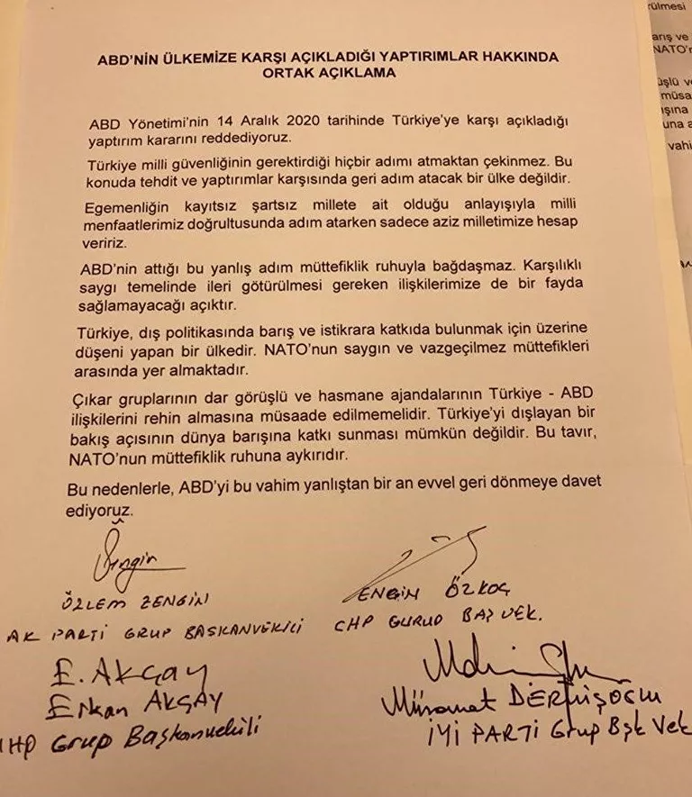 AK Parti, İYİ Parti, MHP ve CHP Grup Başkanvekilleri tarafından imzalanan ortak bildiride, ABD Yönetimi tarafından açıklanan yaptırım kararının reddediliği belirtildi. Türkiye'nin, milli güvenliğini koruma hususunda adım atmaktan hiçbir koşulda kaçmadığı belirtilen ortak bildiride, yaptırım ve tehdit karşısında da Türkiye'nin hiçbir surette geri adım atmayacağı belirtildi. Egemenliğin kayıtsız ve şartsız olarak millete ait olduğuna vurgu yapıldı ve partiler, yalnızca Türk milletine hesap vereceklerini açıkladı.