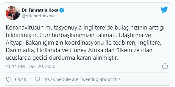 Twitter hesabından bilgilendirmede bulunan Bakan Koca, İngiltere başta olacak şekilde Hollanda, Güney Afrika ve Danimarka'dan yapılacak bütün Türkiye uçuşlarının geçici olarak durdurulduğunu duyurdu. Talimatın bizzat Cumhurbaşkanı Recep Tayyip Erdoğan tarafından verildiği ifade edildi.