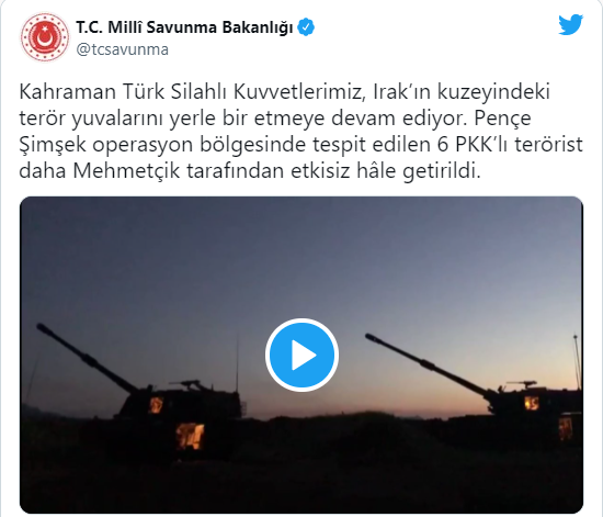 MSB: Kahraman Türk Silahlı Kuvvetlerimiz, Irak’ın kuzeyindeki terör yuvalarını yerle bir etmeye devam ediyor. Pençe Şimşek operasyon bölgesinde tespit edilen 6 PKK’lı terörist daha Mehmetçik tarafından etkisiz hâle getirildi.
