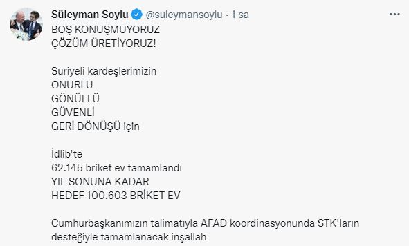 “Suriyeli kardeşlerimizin onurlu, gönüllü, güvenli, geri dönüşü için İdlib'te 62.145 briket ev tamamlandı. Yılsonuna kadar hedef 100.603 briket ev. Cumhurbaşkanımızın talimatıyla AFAD koordinasyonunda STK'ların desteğiyle tamamlanacak inşallah.”
