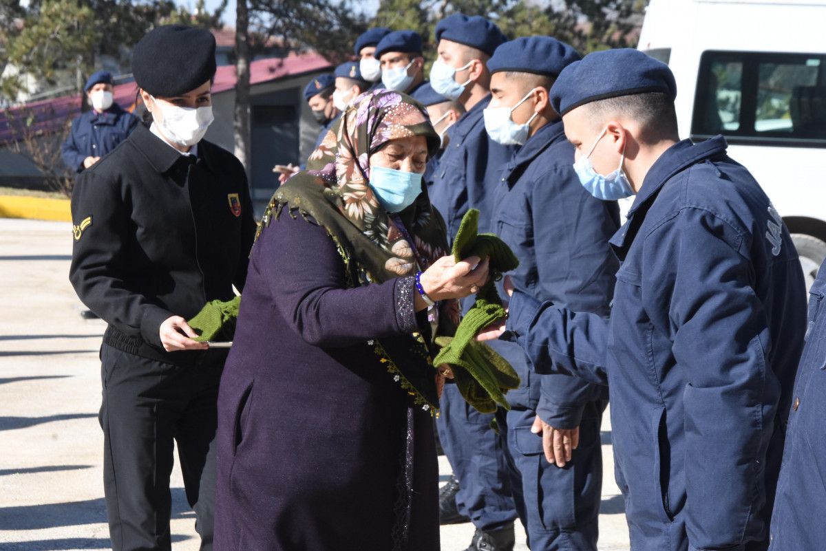 Jandarma Komutanı Albay Ercan Atasoy tarafından karşılanan Ertürk, askerlere tek tek ördüğü çorapları dağıttı.