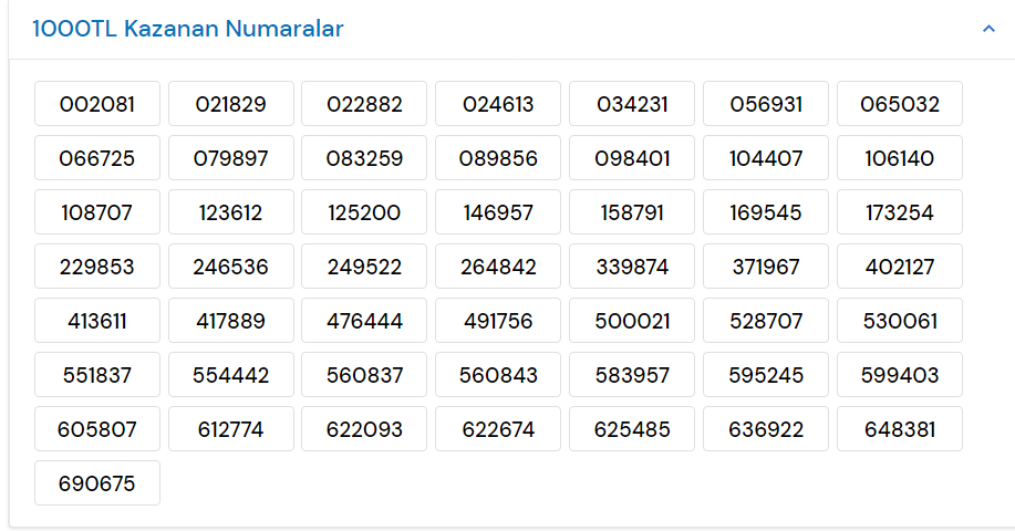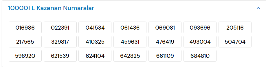 Sitede yayınlanan bilgilere göre 10 bin TL ve bin TL kazanan numaralar şu şekilde listeleniyor;
