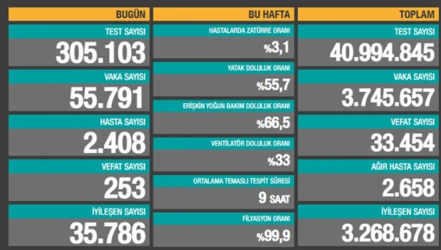 Bu tabloya göre Türkiye'de hayatını kaybedenlerin toplam sayısı 33 bin 454'e yükseldi. Şu ana dek tespit edilen toplam vaka sayısı ise 3 milyon 745 bin 657 olarak belirtildi.