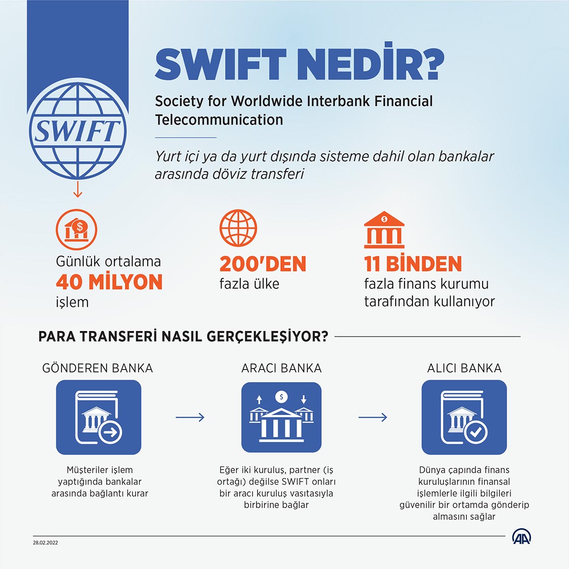 Halihazırda 200'den fazla ülke ile 11 binden fazla finans kurumunun bağlı olduğu SWIFT ile dünyadaki sınır ötesi ödemelerin büyük kısmı gerçekleştiriliyor.