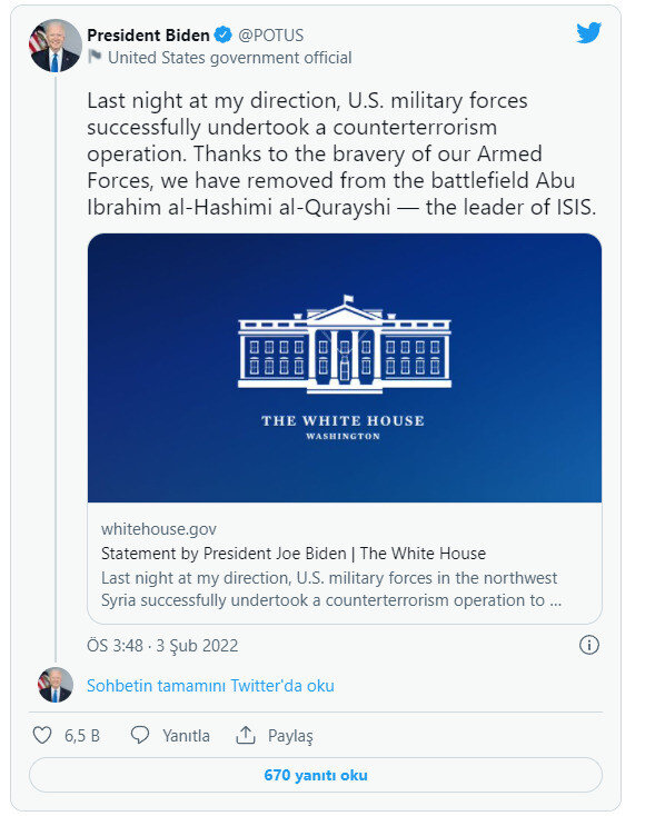 Cesur silahlı kuvvetlerimizin yetenekleri sayesinde DEAŞ lideri İbrahim El-Haşimi El-Kureyşi'yi etkisiz hale getirdik. Operasyondaki tüm Amerikalılar güvenli bir şekilde döndü."