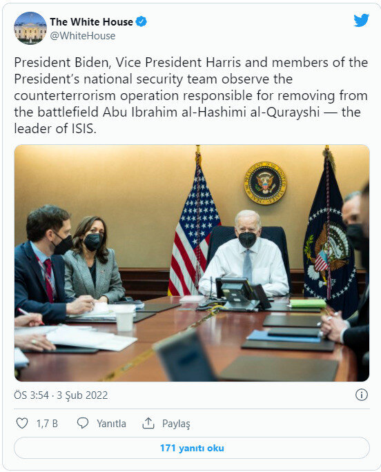 Beyaz Saray'ın sosyal medya hesabından, Başkan Biden, Yardımcısı Kamala Harris ve Ulusal Güvenlik Ekibi üyelerinin operasyonu takip ettikleri fotoğraf paylaşıldı.