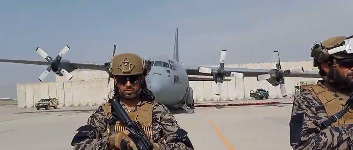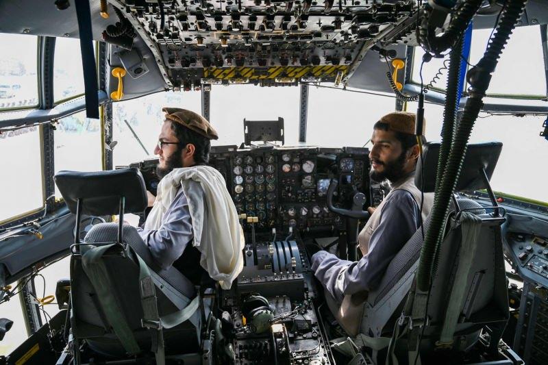Taliban üyeleri, başkent Kabil'deki Uluslararası Hamid Karzai Havalimanı'nda ele geçirilen Amerikan yapımı C-130 Hercules Nakliye Uçağı içinde poz verdi.