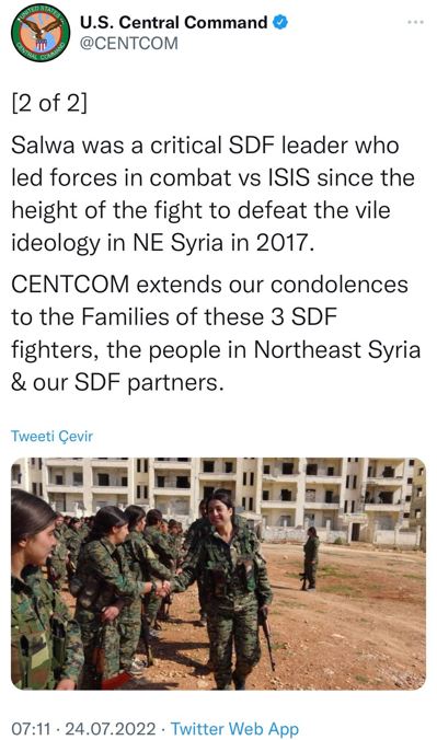 ABD Merkez Komutanlığı (CENTCOM), Milli İstihbarat Teşkilatı’nın Suriye’de düzenlediği SİHA operasyonu ile etkisiz hale getirilen PKK/YPG'li teröristler için taziye mesajı yayınladı.