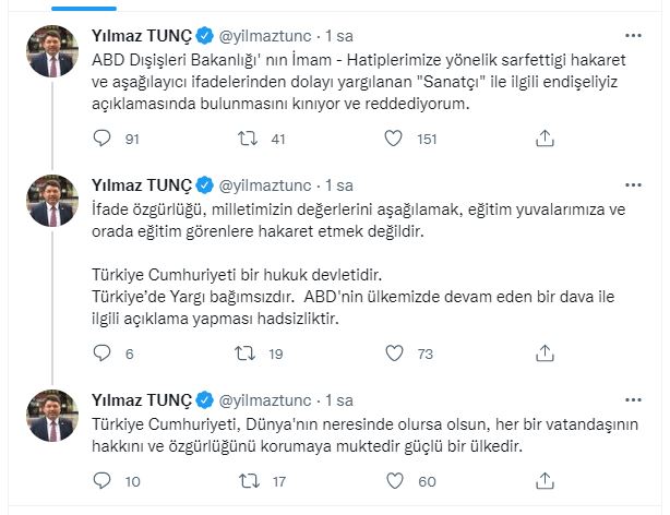 ABD Dışişleri Bakanlığı'nın İmam Hatiplerimize yönelik sarf ettiği hakaret ve aşağılayıcı ifadelerinden dolayı yargılanan "Sanatçı" ile ilgili endişeliyiz açıklamasında bulunmasını kınıyor ve reddediyorum.