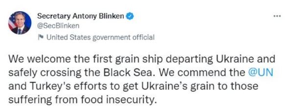 Sosyal medya hesabından açıklama yapan Blinken, “Ukrayna'dan kalkan ve Karadeniz'i güvenli bir şekilde geçen ilk tahıl gemisini memnuniyetle karşılıyoruz. Birleşmiş Milletler'in ve Türkiye'nin krizinin çözümü kapsamında tahılı ihtiyaç olan bölgelere ulaştırma çabalarını takdir ediyoruz” dedi.