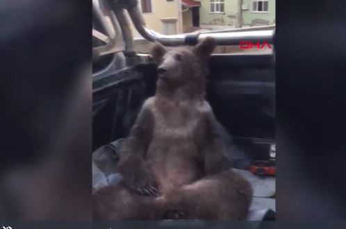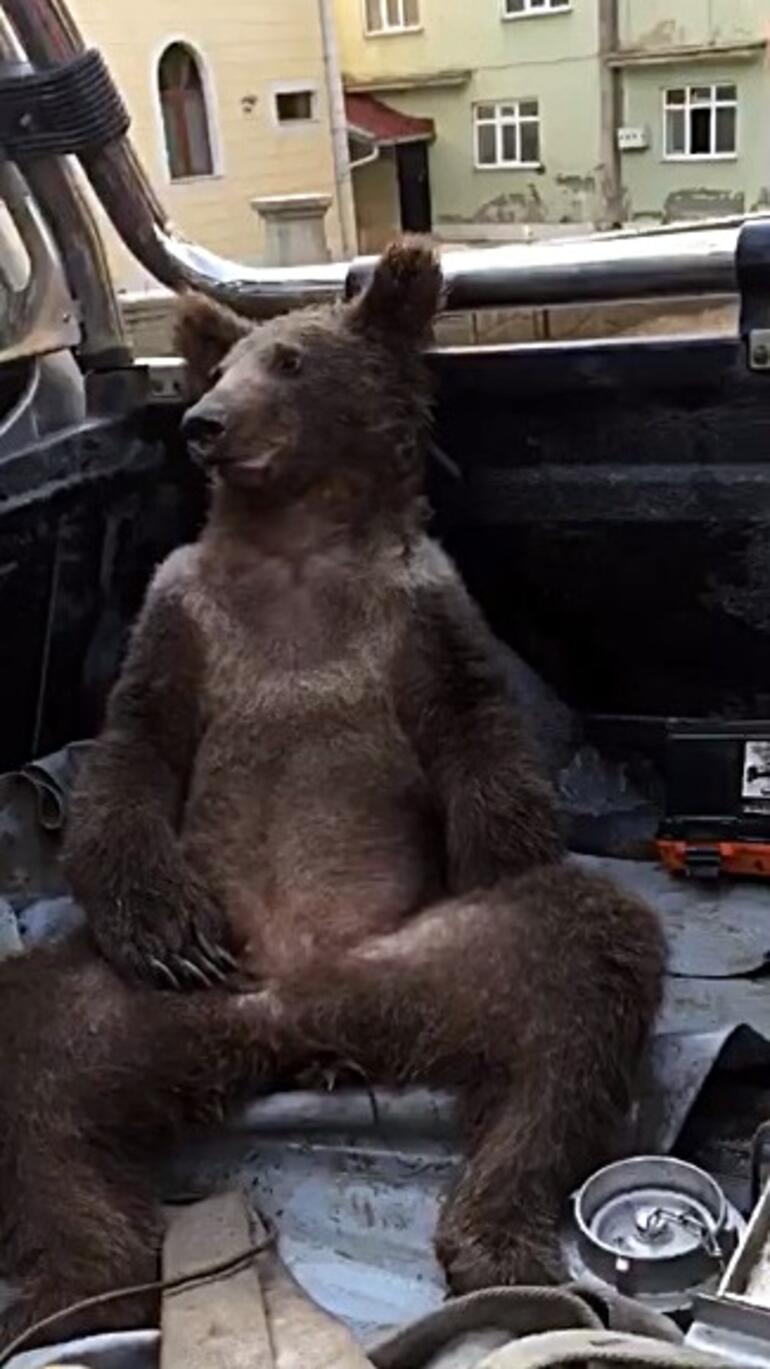 Kamyonetin kasasına oturan ayının sarhoş gibi halleri gülümsetti. Kontrolden geçirilen ayı ormana bırakılırken, kendisine gelmesinin ardından gözden kayboldu.