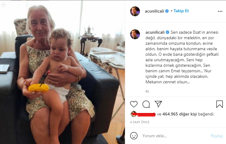 Acun Ilıcalı, Instagram hesabından Esat Yontuç'un annesi Emel Yontuç ve vefatıyla ilgili acısını paylaştı. Ilıcalı, Emel Yontuç'un fotoğrafının altına "Sen sadece Esat’ın annesi değil, dünyadaki bir melektin, en zor zamanımda omzuma kondun, evine aldın, benim hayata tutunmama vesile oldun. O evde bana gösterdiğin şefkati asla unutmayacağım. Seni hep kızlarıma örnek göstereceğim. Sen benim canım Emel teyzemsin... Nur içinde yat, hep aklımda olacaksın. Mekanın cennet olsun..." notu düştü.