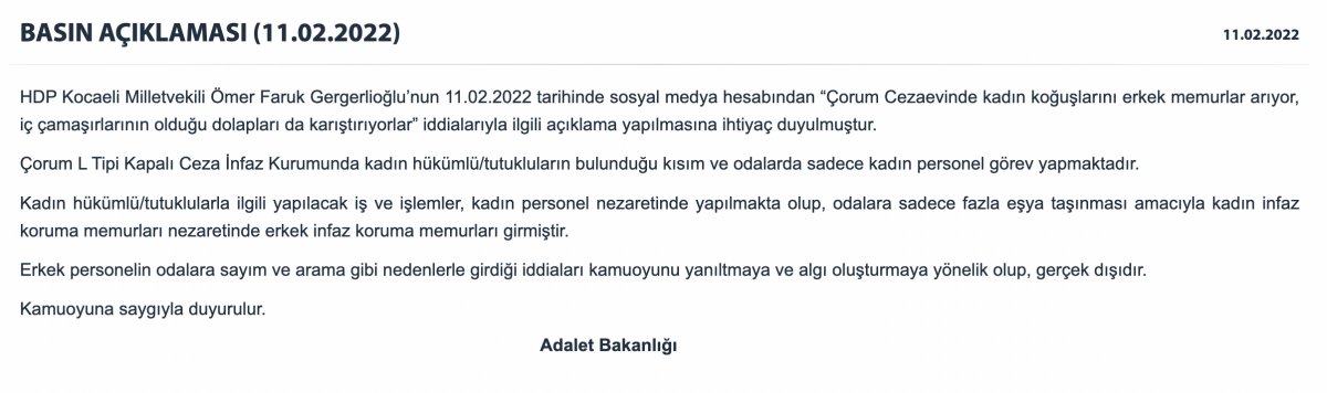 “HDP Kocaeli Milletvekili Ömer Faruk Gergerlioğlu’nun 11.02.2022 tarihinde sosyal medya hesabından ‘Çorum Cezaevi'nde kadın koğuşlarını erkek memurlar arıyor, iç çamaşırlarının olduğu dolapları da karıştırıyorlar’ iddialarıyla ilgili açıklama yapılmasına ihtiyaç duyulmuştur. Çorum L Tipi Kapalı Ceza İnfaz Kurumu'nda kadın hükümlü/tutukluların bulunduğu kısım ve odalarda sadece kadın personel görev yapmaktadır. Kadın hükümlü/tutuklularla ilgili yapılacak iş ve işlemler, kadın personel nezaretinde yapılmakta olup, odalara sadece fazla eşya taşınması amacıyla kadın infaz koruma memurları nezaretinde erkek infaz koruma memurları girmiştir. Erkek personelin odalara sayım ve arama gibi nedenlerle girdiği iddiaları kamuoyunu yanıltmaya ve algı oluşturmaya yönelik olup, gerçek dışıdır.”