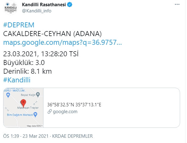 Kandilli Rasathanesi tarafından Twitter üzerinden yapılan açıklamada depremin merkezüssünün Çakaldere Seyhan olduğu belirtildi.