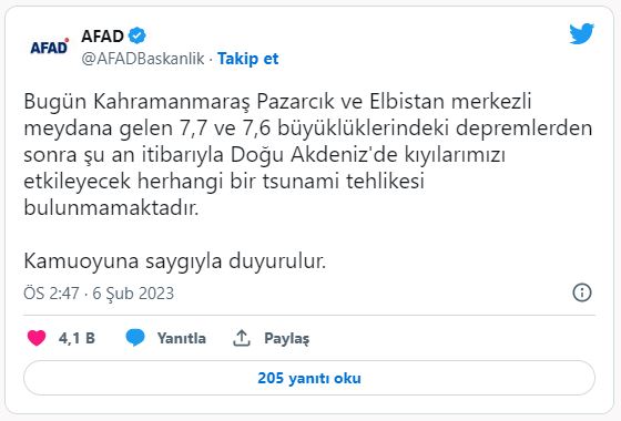 Pazarcık ve Elbistan merkezli meydana gelen 7,7 ve 7,6 büyüklüklerindeki depremin ardından AFAD'dan tsunami iddiaları hakkında açıklama yapıldı.
