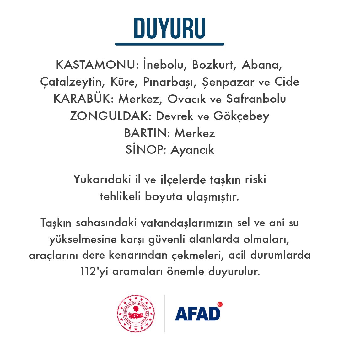 Afet ve Acil Durum Yönetimi Başkanlığı'nın (AFAD), sosyal medya hesabından yapılan duyuruda, Kastamonu'nun İnebolu, Bozkurt, Abana, Çatalzeytin, Küre, Pınarbaşı, Şenpazar ve Cide ilçeleri, Karabük Merkez, Ovacık ve Safranbolu, Zonguldak'ın Devrek ve Gökçebey ilçeleri ile Bartın'ın Merkez ve Sinop'un Ayancık ilçesinde, taşkın riskinin tehlikeli boyuta geldiği belirtildi.