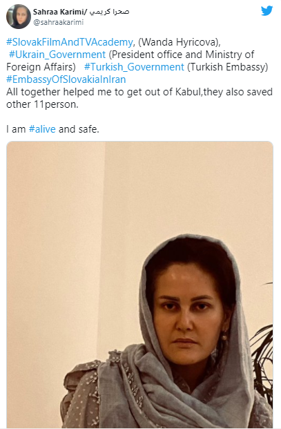 Türkiye’nin gönderdiği tahliye uçağıyla Afganistan’dan çıkış yapan Afgan Yönetmen ve Film Yapımcısı Sahraa Karimi, kendisiyle birlikte 11 kişilik ailesinin de tahliye edildiğini açıklayarak, Türkiye ve Ukrayna’ya teşekkür etti.