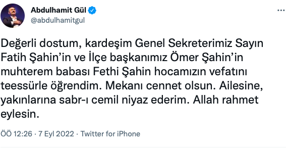 AK Parti Genel Başkan Yardımcısı Şahin'in acı günüAK Parti Genel Sekreteri Fatih Şahin'in babası Fethi Şahin vefat etti.07 Eylül 2022, Çarşamba - 08:00 AK Parti Genel Sekreteri Fatih Şahin'in babası Fethi Şahin, vefat etti. Acı haberi Abdulhamit Gül sosyal medya hesabından duyurdu.Fatih Şahin'e sosyal medyadan birçok başsağlığı mesajı geldi. CHP'nin para sayma kuleleri davası 15 Nisan 2026'ya ertelendi.Etiketler: Fatih Şahin Fethi Şahin AK Parti