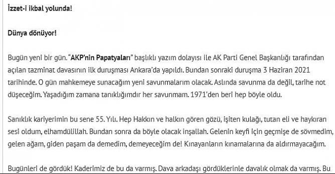 "AK Parti Genel Başkanlığının aleyhime açtığı davanın bugün ilk duruşması vardı. Usulü eksiklikler için karşı tarafa süre verildi ve duruşma Haziran ayına ertelendi." dedi.
