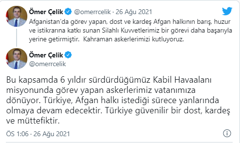 AK Parti Sözcüsü Ömer Çelik, "6 yıldır sürdürdüğümüz Kabil Havaalanı misyonunda görev yapan askerlerimiz vatanımıza dönüyor" dedi.