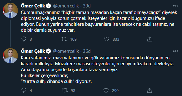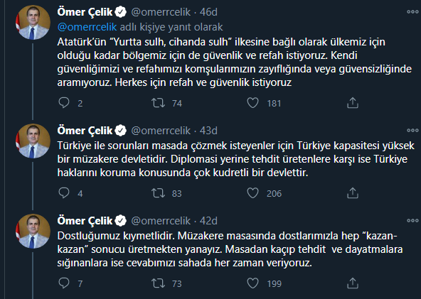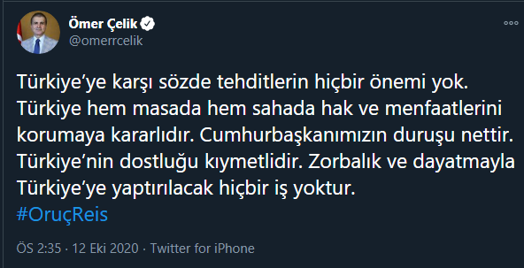 "Türkiye’ye karşı sözde tehditlerin hiçbir önemi yok. Türkiye hem masada hem sahada hak ve menfaatlerini korumaya kararlıdır. Cumhurbaşkanımızın duruşu nettir. Türkiye’nin dostluğu kıymetlidir. Zorbalık ve dayatmayla Türkiye’ye yaptırılacak hiçbir iş yoktur.
