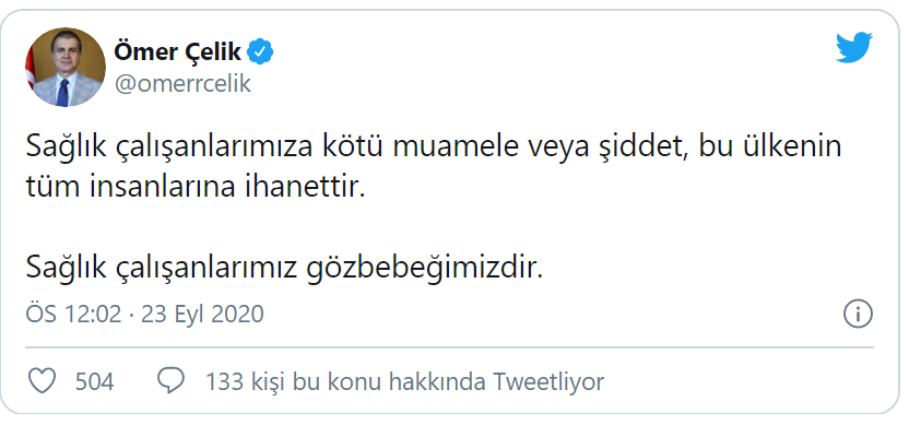 "Sağlık çalışanlarımıza kötü muamele veya şiddet, bu ülkenin tüm insanlarına ihanettir. Sağlık çalışanlarımız gözbebeğimizdir.