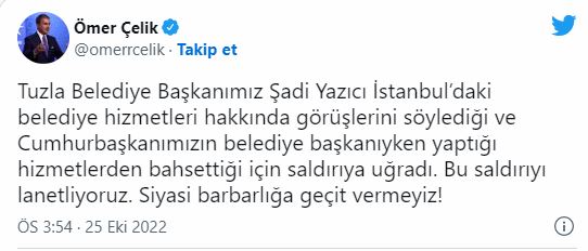 AK Parti Genel Başkan Yardımcısı ve Parti Sözcüsü Ömer Çelik, Twitter hesabından, "Tuzla Belediye Başkanımız Şadi Yazıcı İstanbul’daki belediye hizmetleri hakkında görüşlerini söylediği ve Cumhurbaşkanımızın belediye başkanıyken yaptığı hizmetlerden bahsettiği için saldırıya uğradı. Bu saldırıyı lanetliyoruz. Siyasi barbarlığa geçit vermeyiz!" mesajını paylaştı.