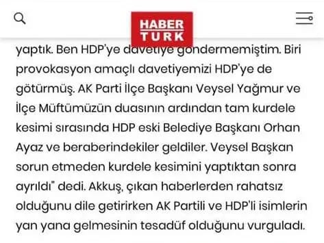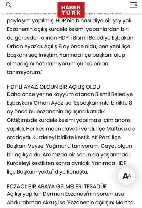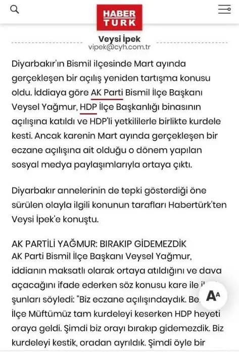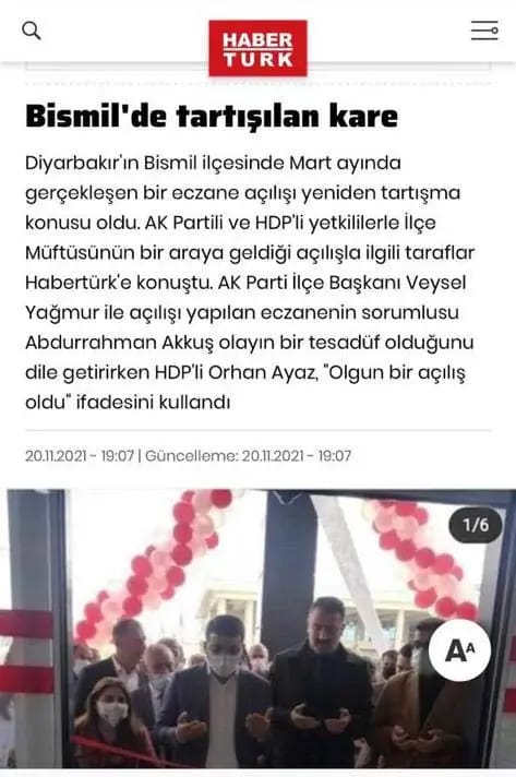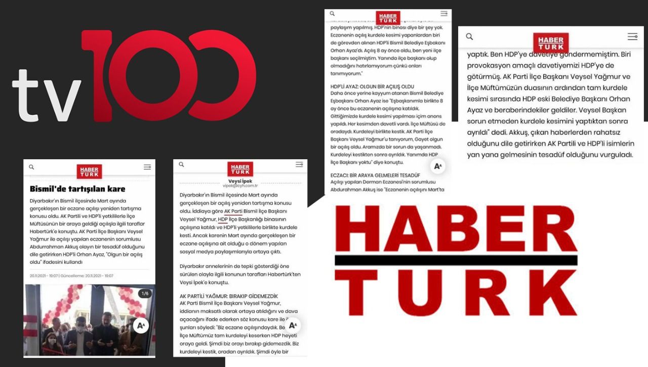 Diyarbakır’da AK Parti Bismil İlçe Başkanı Veysel Yağmur’un “HDP İlçe binası açılışına katıldığı”na dair haber gerçek dışı çıktı. Söz konusu etkinliğin, bir eczane açılışı olduğu, açılışa ilin ileri gelenlerinin katıldığı bildirildi. Ayrıca açılışın Mart ayında yapıldığı saptandı. Başkan Yağmur'u hedef tahtasına oturtan, doğrudan da Cumhur İttifakı'nı yıpratma amacı güden kumpasta TV100 ve Habertürk başrol oynadı.