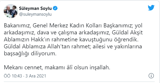 "Bakanımız, Genel Merkez Kadın Kolları Başkanımız, yol arkadaşımız, dava ve çalışma arkadaşımız Güldal Akşit ablamızın Hakk’ın rahmetine kavuştuğunu öğrendik. Güldal ablamıza Allah’tan rahmet, ailesi ve yakınlarına başsağlığı diliyorum