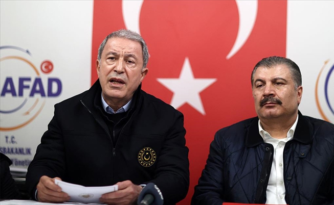 Milli Savunma Bakanı Hulusi Akar, Sağlık Bakanı Fahrettin Koca ile merkez üssü Kahramanmaraş'ın Pazarcık ve Elbistan ilçeleri olan ve 10 ili etkileyen depremlerin ardından arama kurtarma çalışmalarının sürdüğü Hatay'daki Acil Durum Koordinasyon Merkezi'nde açıklama yaptı.
