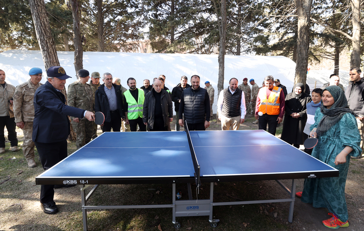 Bazı depremzede çocuklarla masa tenisi de oynayan Bakan Akar, ziyaretiyle çocuklara moral verdi.