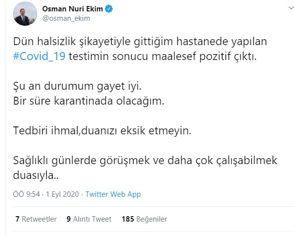 "Dün halsizlik şikayetiyle gittiğim hastanede yapılan Covid_19 testimin sonucu maalesef pozitif çıktı. Şu an durumum gayet iyi. Bir süre karantinada olacağım. Tedbiri ihmal,duanızı eksik etmeyin. Sağlıklı günlerde görüşmek ve daha çok çalışabilmek duasıyla.." dedi.