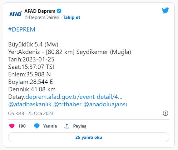 AFAD'dan yapılan açıklamada, Muğla'nın Seydikemer ilçesine 80 kilometre açığında 5,4 büyüklüğünde deprem meydana geldi.