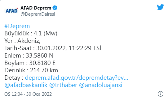 Afet ve Acil Durum Yönetimi Başkanlığı (AFAD)'dan alınan bilgiye saat 11.22'de Akdeniz'de 4.1 büyüklüğünde deprem meydana geldiği bildirildi.