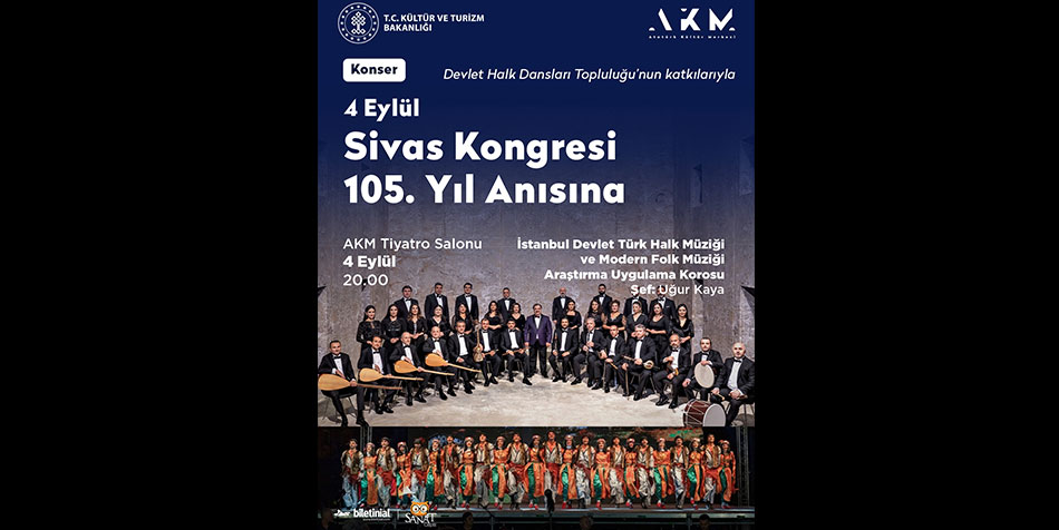 Cumhuriyetin temellerinin atıldığı Sivas Kongresi'nin 105. Yılı anısına, İstanbul Devlet Türk Halk Müziği Korosu, Modern Folk Müziği Araştırma Korosu ve İstanbul Devlet Halk Dansları Topluluğu'nun birlikte sahne alacağı konser, 4 Eylül 2024 tarihinde saat 20.00'de Atatürk Kültür Merkezi Tiyatro Salonunda gerçekleşecek.