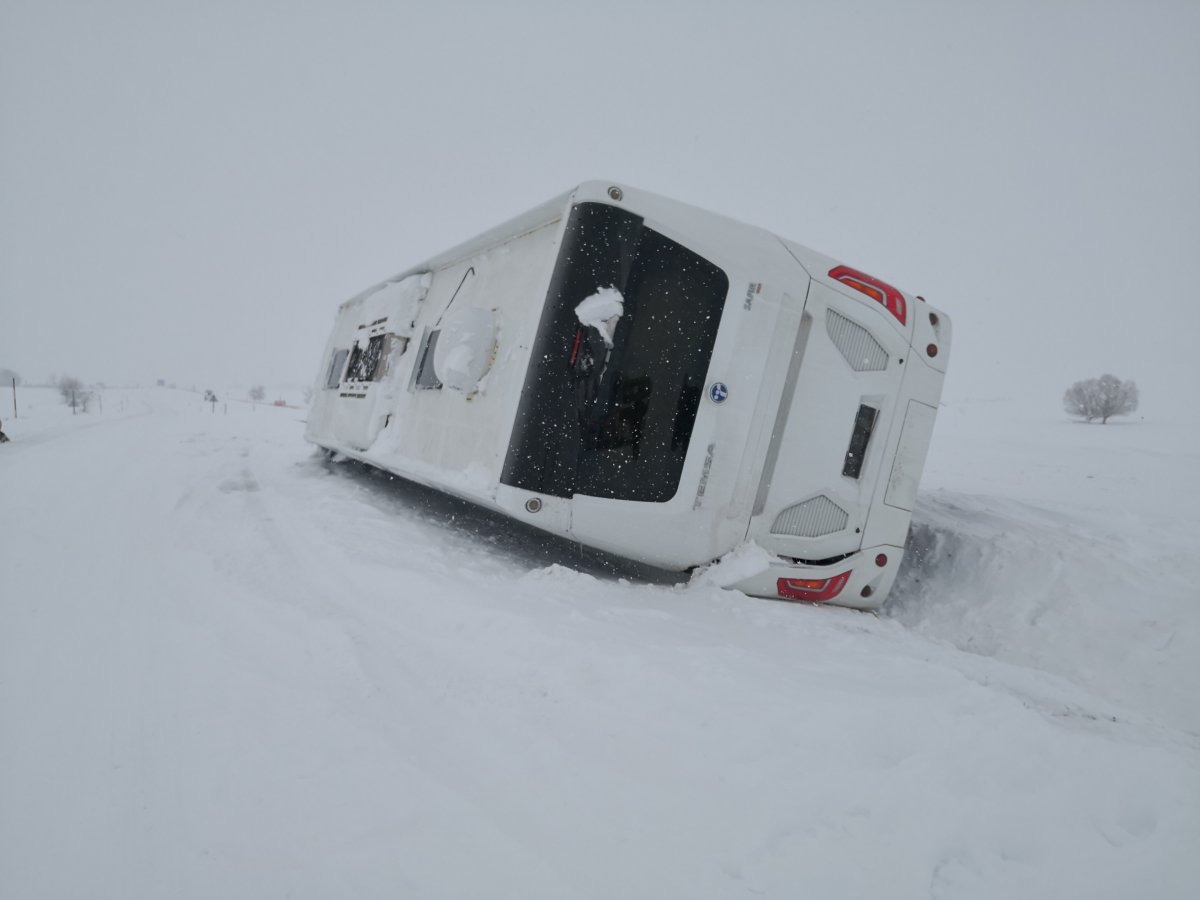 Nevşehir’den Antalya’ya yerli ve yabancı turist taşıyan İsmail B. (43) idaresindeki 07 AHS 668 plakalı tur otobüsü, Aksaray'da yoğun kar yağışı ve yolun buzlanması nedeniyle kontrolden çıkarak refüje devrildi.