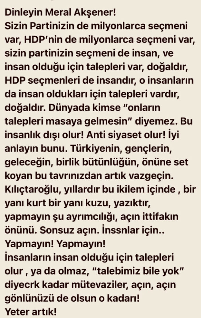 Dinleyin Meral Akşener: Sizin partinizin de milyonlarca seçmeni var; HDP’nin de milyonlarca seçmeni var. Sizin partinizin seçmeni de insan ve insan oldukları için talepleri var; doğaldır… HDP seçmenleri de insandır. O insanların da insan oldukları için talepleri vardır; doğaldır. Dünyada kimse ‘Onların talepleri masaya gelmesin’ diyemez. Bu insanlık dışı olur, anti siyaset olur. İyi anlayın bunu. Türkiye’nin, gençlerin, geleceğin, birlik ve bütünlüğün önüne set koyan bu tavrınızdan vazgeçin. Kılıçdaroğlu yıllardır bu ikilem içinde. Bir yanı kurt, bir yanı kuzu… Yazıktır! Yapmayın şu ayrımcılığı, açın ittifakın önünü; sonsuz açın, insanlar için! Yapmayın! İnsanların insan olduğu için talepleri olur ya da olmaz. ‘Talebimiz bile yok’ diyecek kadar mütevazılar. Açın gönlünüzü de olsun o kadarı. Yeter artık!