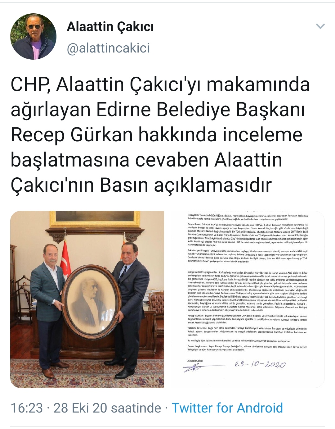 Cumhuriyet Halk Partisi'nin (CHP) Alaattin Çakıcı'yı makamında ağırlayan Edirne Belediye Başkanı Recep Gürkan hakkında inceleme başlatmasına cevaben Alaattin Çakıcı, danışmanı Gazeteci Ferhat Aydoğan aracılığı ile kendi sosyal medya hesabından basın açıklaması yaptı.