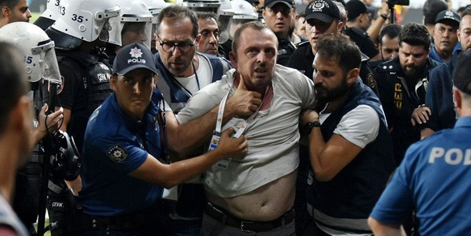 Trendyol Süper Lig'in ikinci haftasında oynanan Göztepe-Fenerbahçe karşılaşmasında Fenerbahçe Spor Kulübü Başkanı Ali Koç'u iterek düşüren zanlı gözaltına alındı.