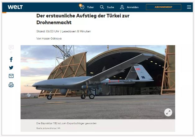 Welt gazetesinde çıkan "Türkiye'nin drone gücündeki inanılmaz yükselişi" başlıklı haberde, "Türkiye'nin; dünyanın en aktif S/İHA güçlerinden biri olması, Batı'da soğuk duş etkisine neden oldu. Zira kimse Türkiye'yi üst düzey askeri teknoloji üreticisi olarak hesaba katmıyordu. Türk drone'u Bayraktar TB2 sektörü değiştirdi. Ukrayna savaşında, Ukrayna ordusunun etkili bir silahı haline geldi" denildi.