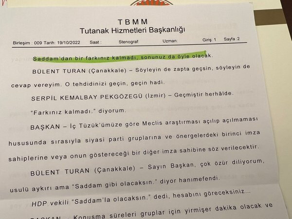 Bülent Turan: Sayın Başkan, çok özür diliyorum usulü aykırı ama "Saddam gibi olacaksın" diyor hanımefendi. HDP vekili "Saddam'la olacaksın" dedi, hesabını göreceksiniz.