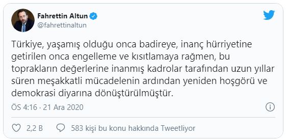 Sosyal medya platformu Twitter üzerindeki resmi hesabından bir açıklamada bulunan İletişim Başkanı Fahrettin Altun, Türkiye'nin yaşadığı onca badireye, inanç özgürlüğüne getirilen kısıtlama ve engellemelere rağmen, uzun yıllar boyunca süren zorlu mücadele sonrasında bu toprakların tekrardan demokrasi ve hoşgörü diyarına dönüştüğünü kaydetti.