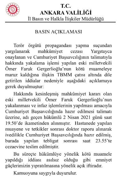 ''Terör örgütü propagandası yapma suçundan yargılanarak mahkûmiyet cezası Yargıtay ca onaylanan ve Cumhuriyet Başsavcılığının talimatıyla hakkında yakalama işlemi yapılan eski milletvekili Ömer Faruk Gergerlioğlu’nun kötü muameleye maruz kaldığına ilişkin TBMM çatısı altında dile getirilen iddialar nedeniyle aşağıdaki açıklamaya gerek duyulmuştur: