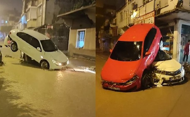 İlçe merkezinde sel nedeniyle bazı araçlar sürüklendi.