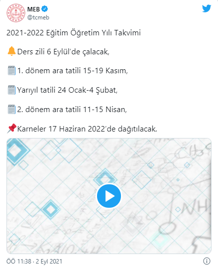 Ders zili 6 Eylül’de çalacak. 1. dönem ara tatili 15-19 Kasım, 2. dönem ara tatili 11-15 Nisan arasında olacak.