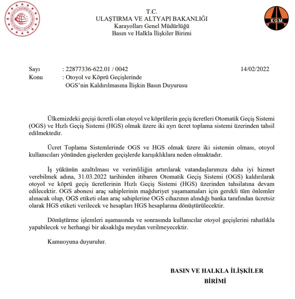 Karayolları Genel Müdürlüğü, otoyol ve köprü geçişlerinde OGS'nin kaldırıldığını duyurdu. Geçiş ücretleri HGS üzerinden tahsil edilecek. OGS cihazları banka tarafından ücretsiz olarak HGS etiketine dönüştürülecek. Uygulama 31 Mart'ta başlayacak.