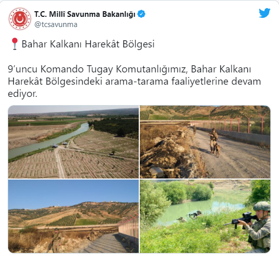 Milli Savunma Bakanlığı (MSB), "9’uncu Komando Tugay Komutanlığımız, Bahar Kalkanı Harekât Bölgesindeki arama-tarama faaliyetlerine devam ediyor." açıklamasında bulundu.