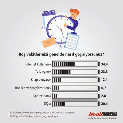 Areda Survey yaptığı araştırmada Türk halkının boş zamanını nasıl değerlendirdiğini inceledi. Araştırmada katılımcılara beş seçenek sunularak, bunlardan hangisiyle en fazla uğraşıldığı tespit edildi. Araştırma sonuçlarına göre, Türkiye’de insanlar boş zamanlarını en fazla internet ortamında değerlendirdiği ortaya çıktı.